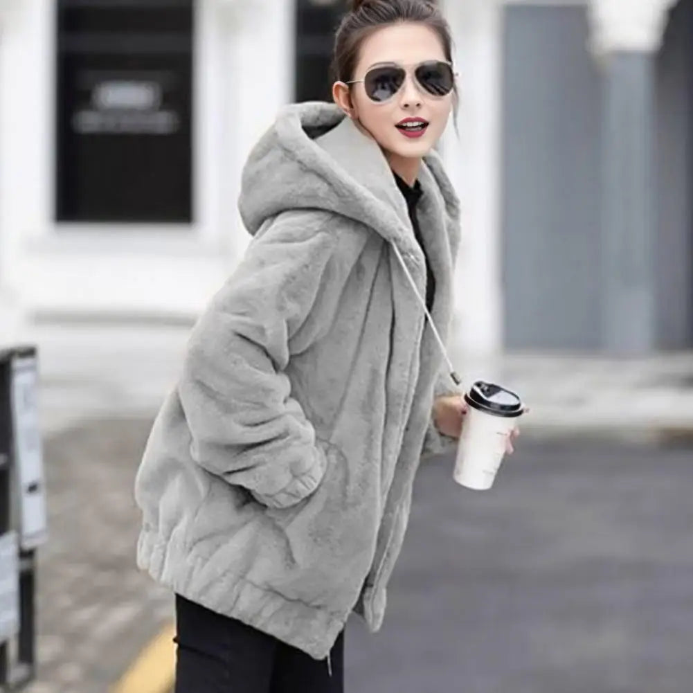 A Jaqueta Plush com Capuz é perfeita para te manter aquecida com muito estilo nos dias frios. Com toque macio que lembra pele de coelho, ela tem modelagem confortável, capuz com ajuste e bolsos laterais. Ideal para o inverno ou dias mais gelados do outono.